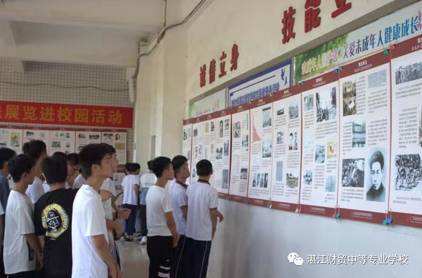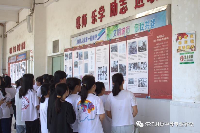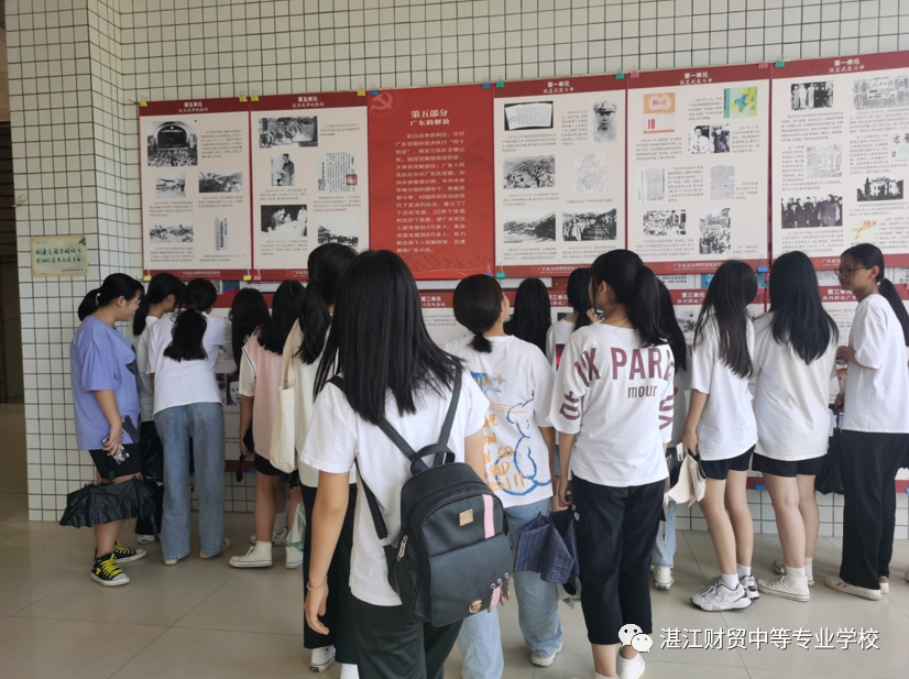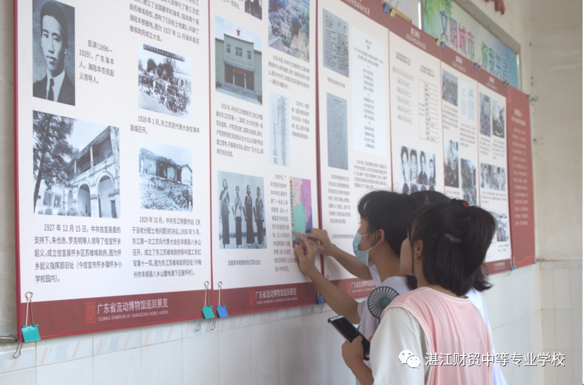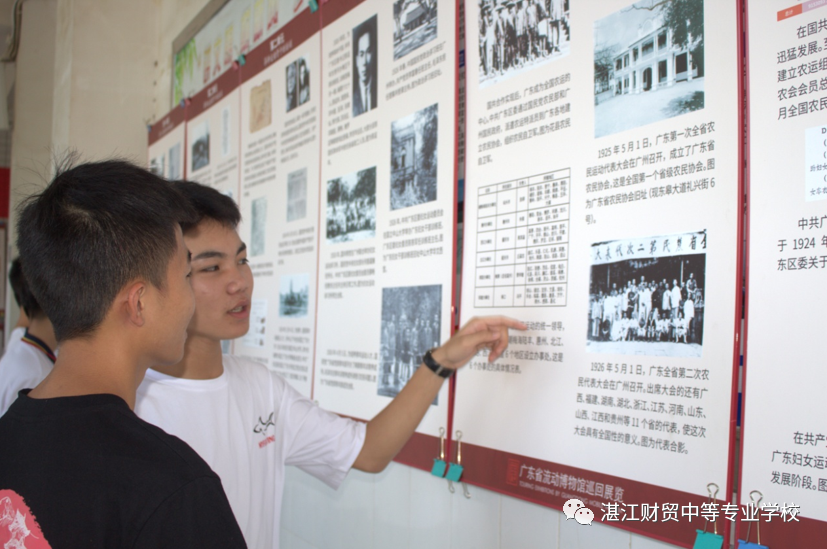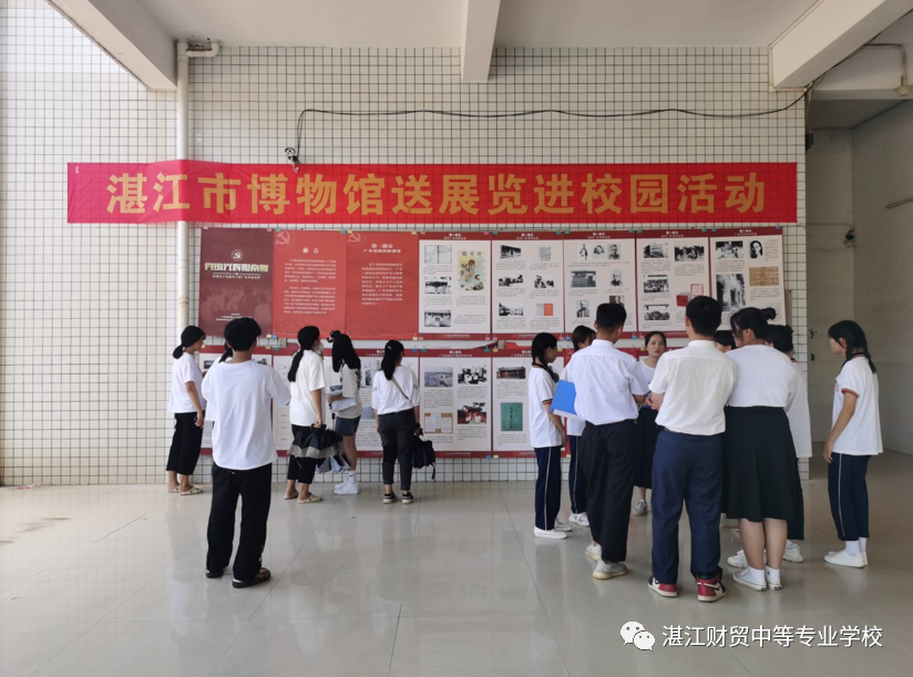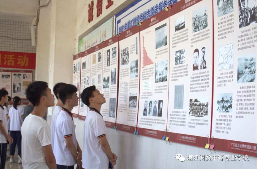 5月18日—5月25日,在湛江财贸学校进行由市文广旅体局、市博物馆主办的送展览进校园之《党的光辉照南粤——中国共产党领导下的广东革命历程》图片展,学校积极组织师生们有序观展。厚重的历史、恢宏的场景、珍贵的照片,让同学们重温了那段波澜壮阔的历史风云,同学们在红色经典文化中汲取了丰富的文化营养,认真观看每一块展板,还不时记录重点内容,整个现场气氛十分活跃。