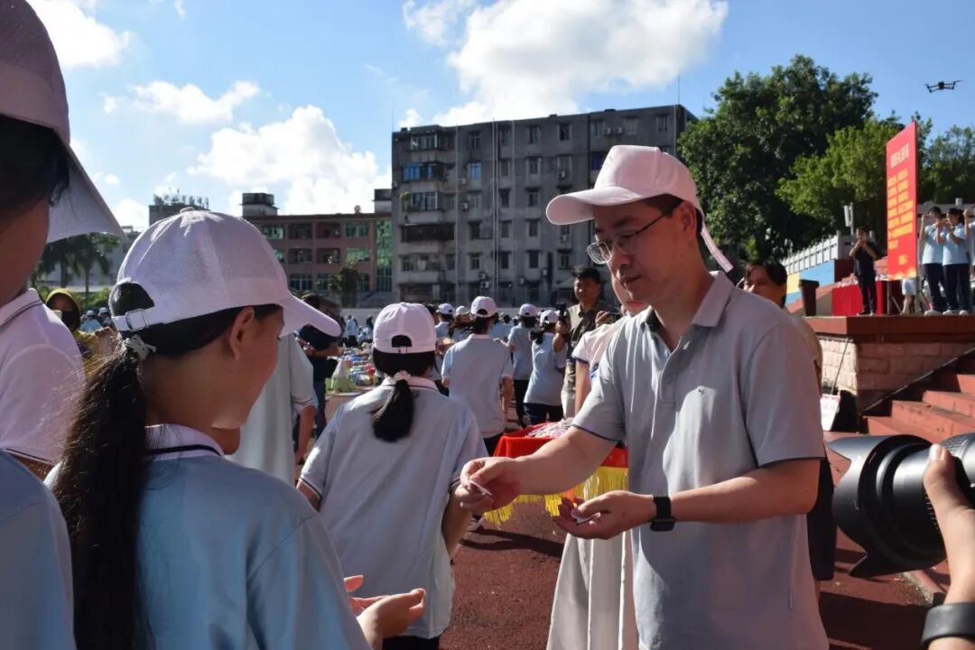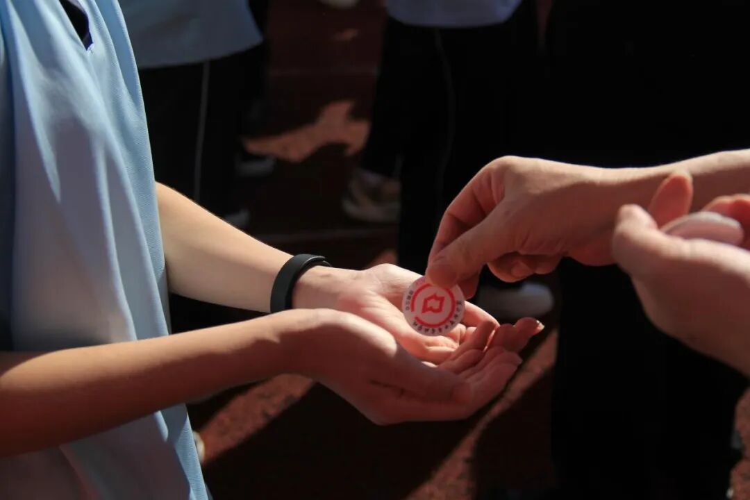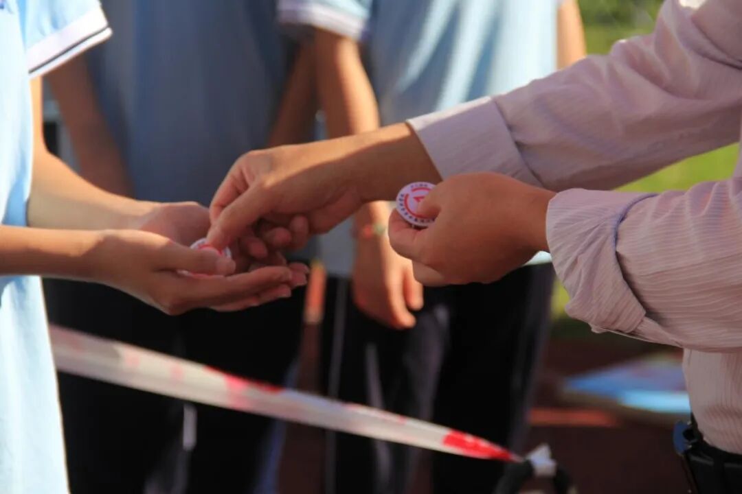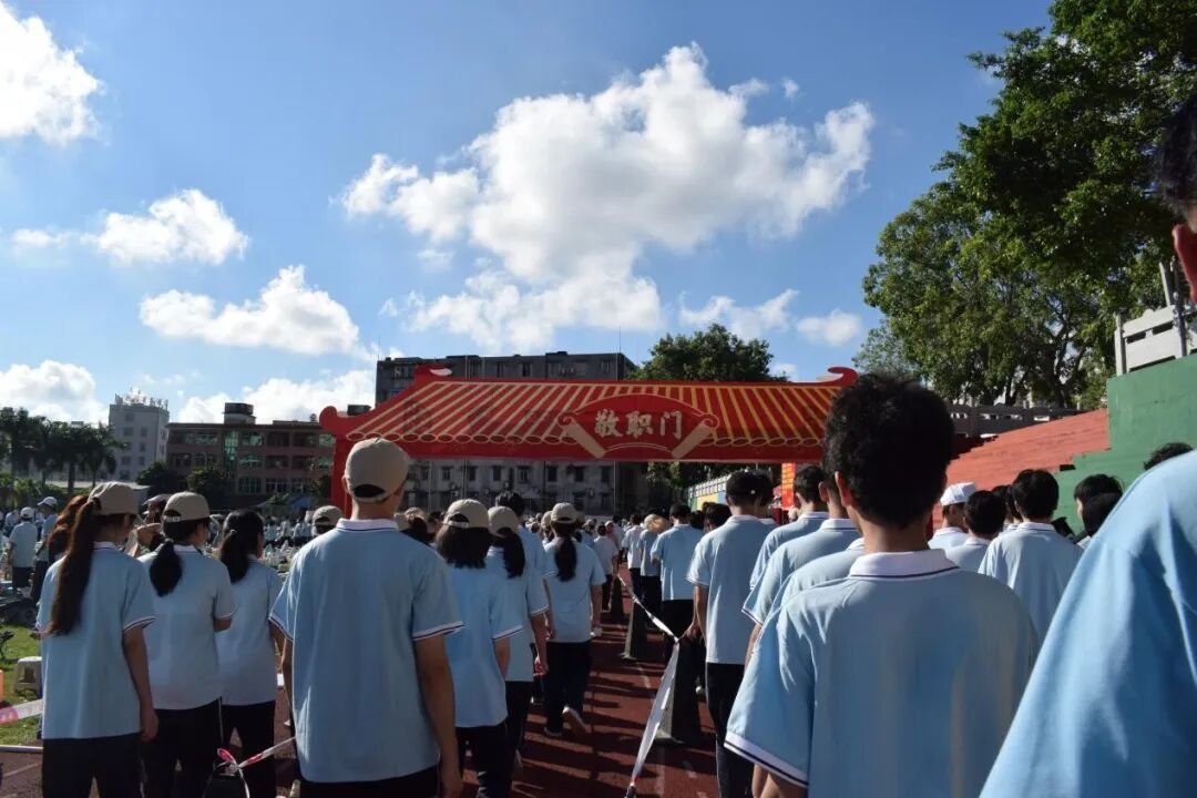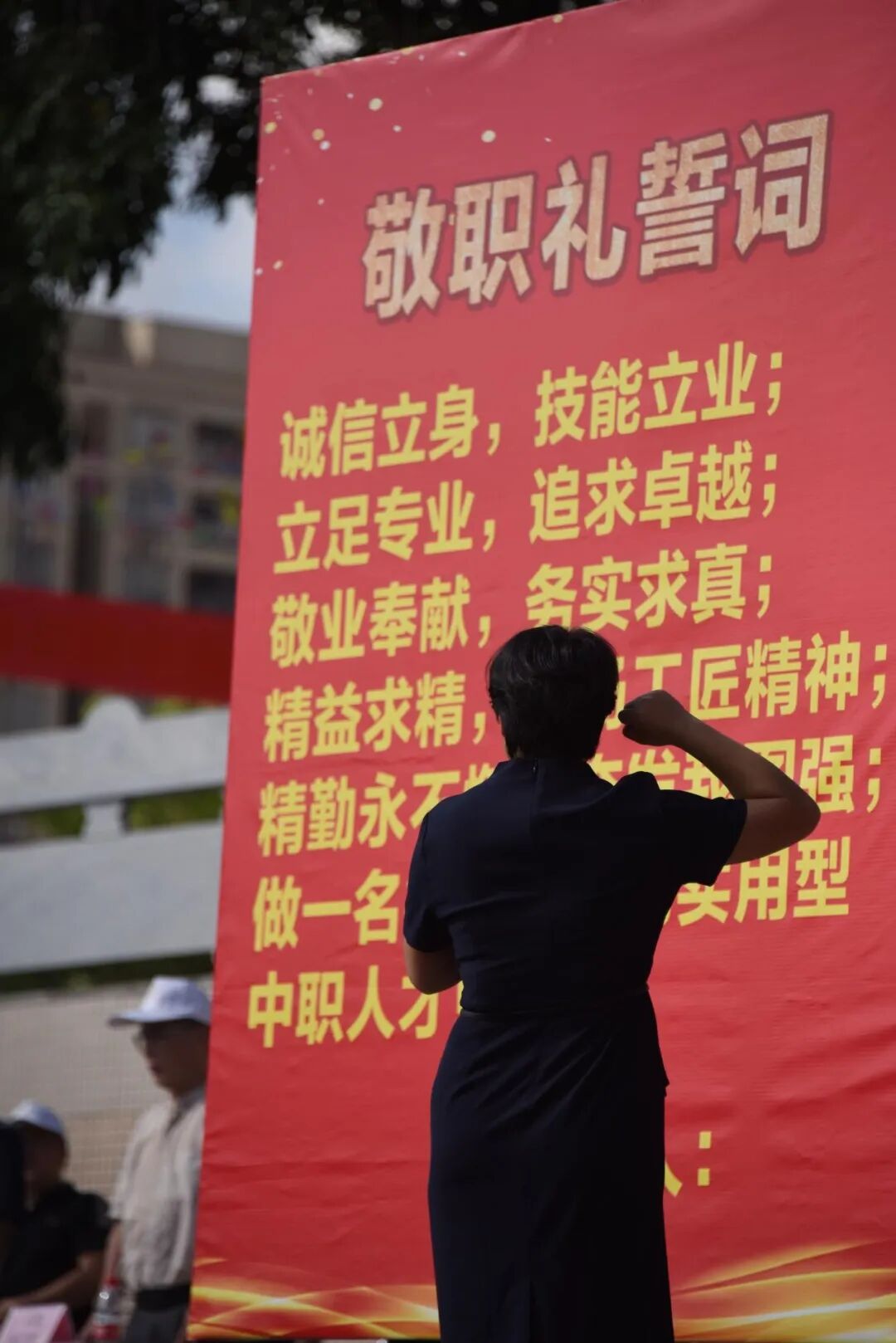 同学们列成四纵队,依次走过“敬职门”,象征着正式开启中职生涯。各科室科长为每位新生佩戴校徽,勉励他们牢记“敬业、精益、专注、创新”的工匠精神。