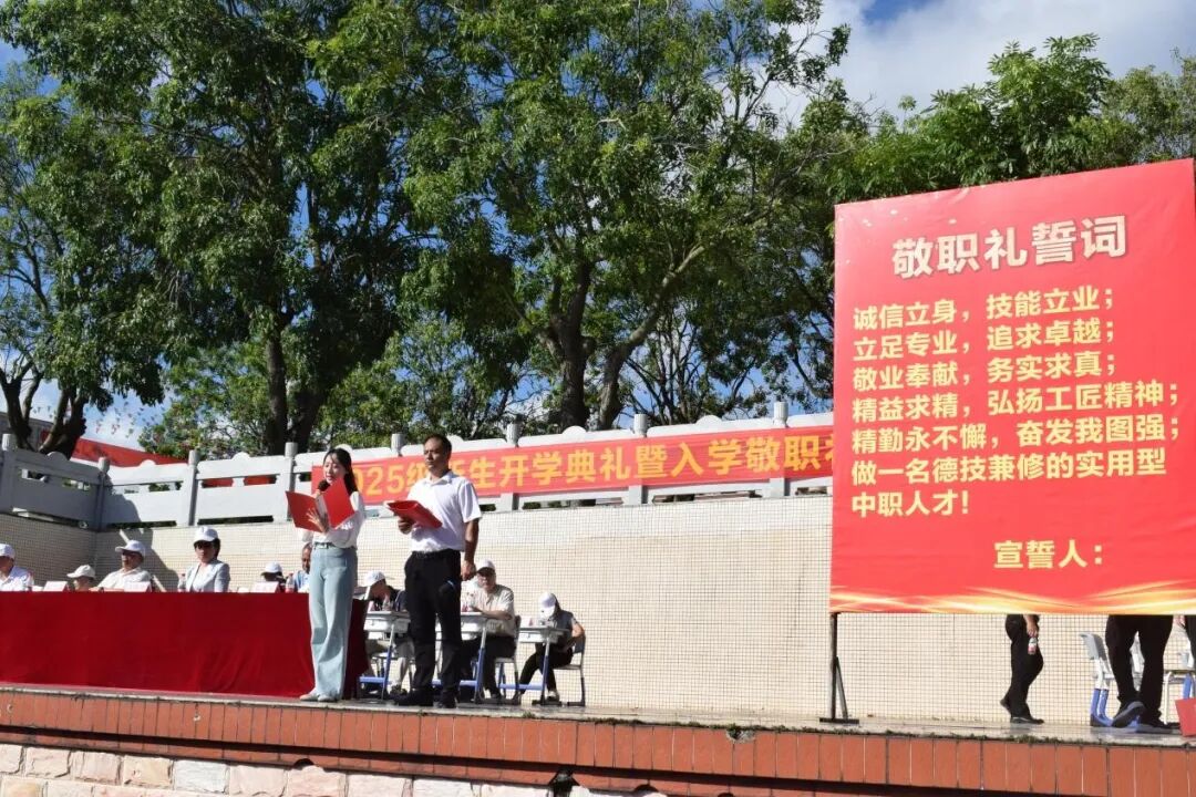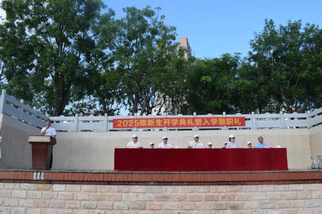9月15日上午,晨曦微露,天朗气清,温柔的阳光穿过轻云洒向校园,拂面的微风带着初秋的凉意与希望的气息。湛江财贸中等专业学校2025级新生开学典礼暨敬职礼在学校运动场隆重举行。校领导、各科室负责人、2025级班主任及全体新生共同参加了这一庄严而温馨的仪式,开学典礼由学生科科长杨智伟主持。