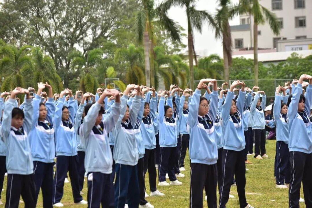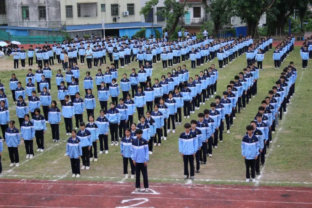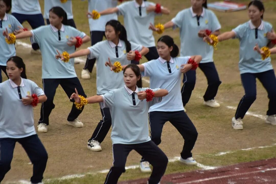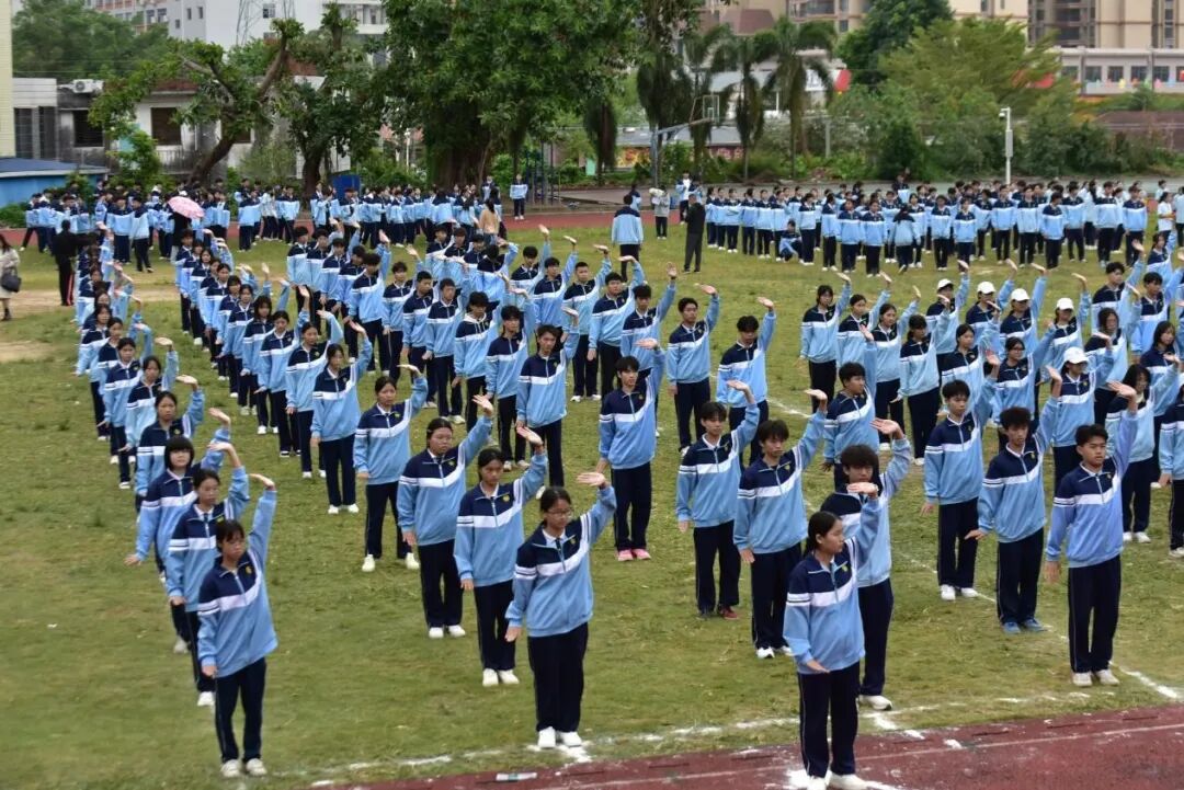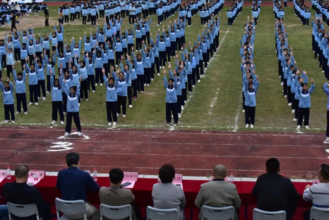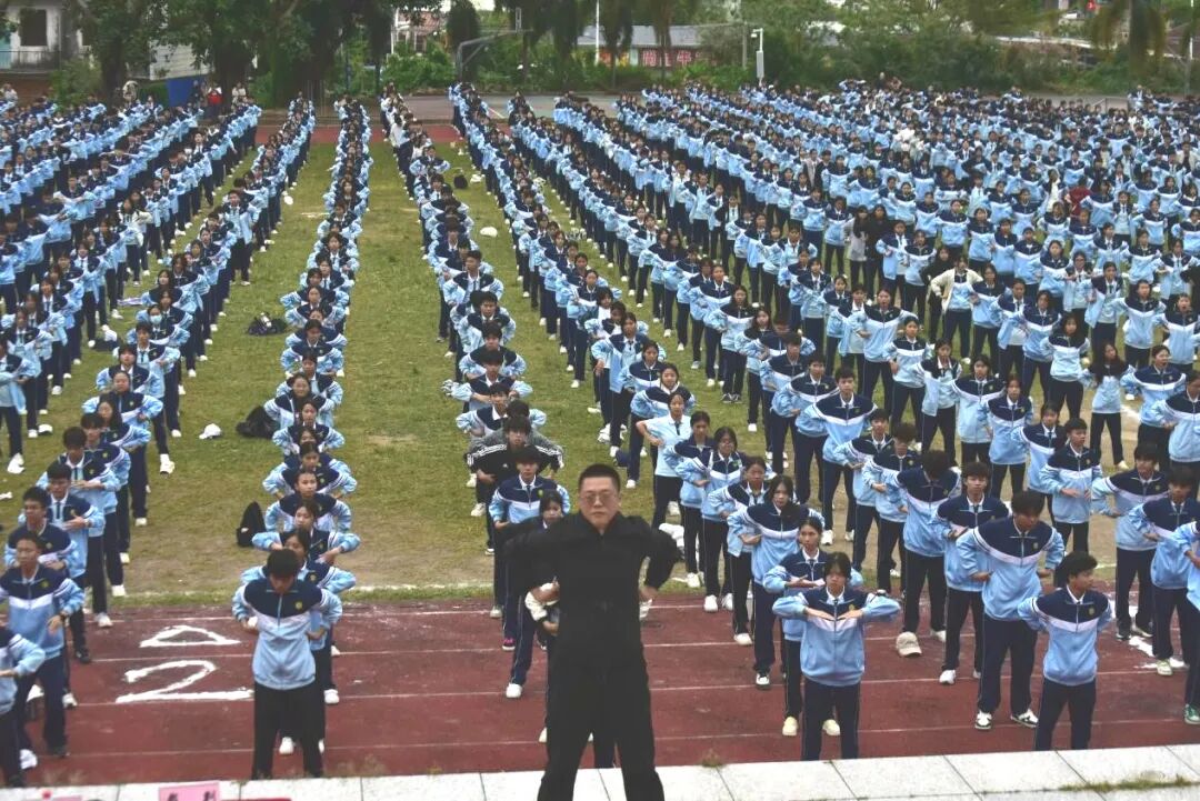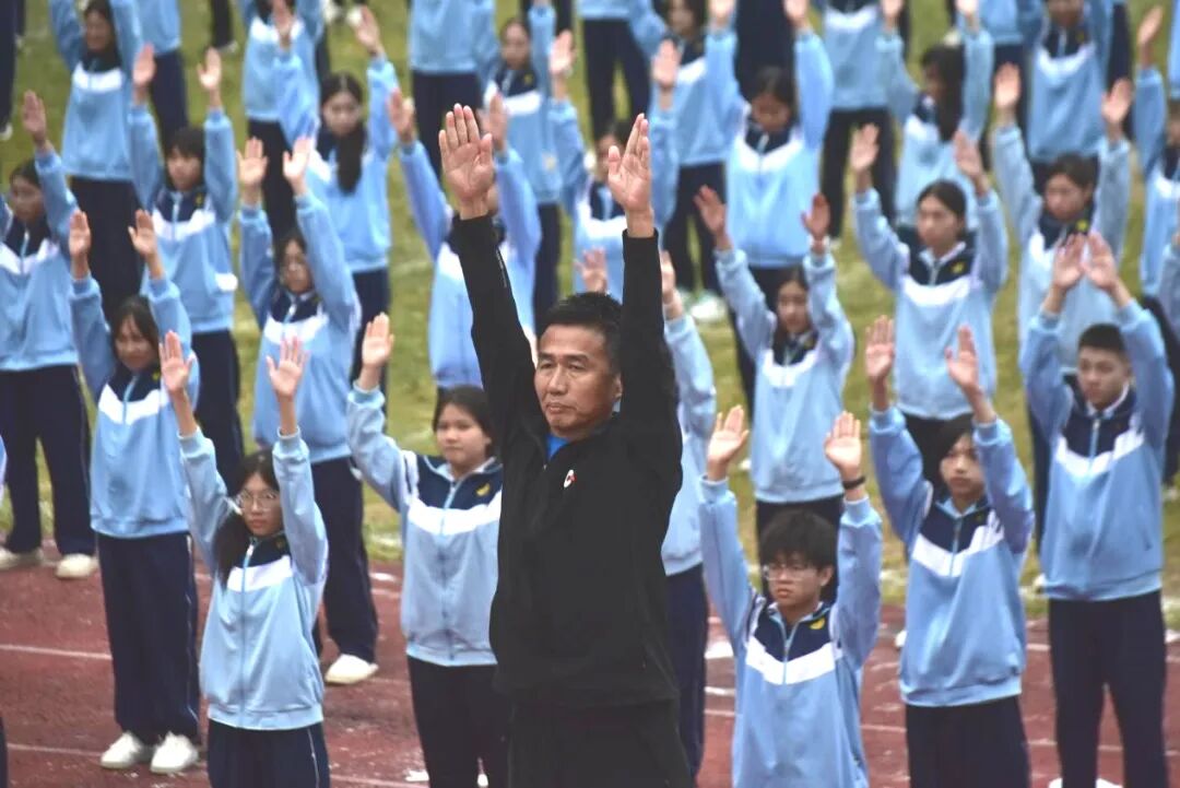 赛事收官之际,体育教研组老师们领衔带队,全体新生共同演绎“千人八段锦”,场面气势恢弘。