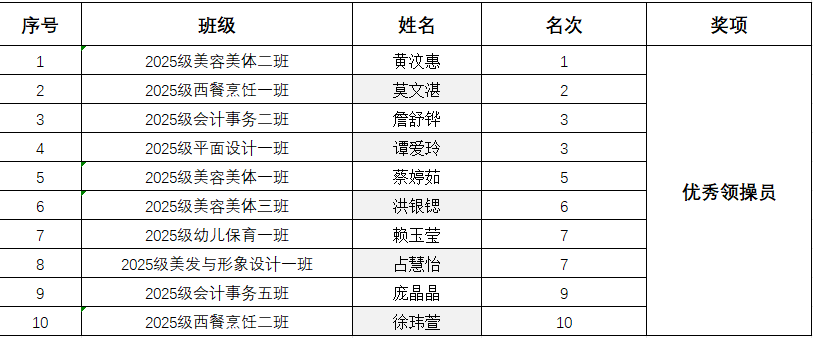 经过激烈而有序的角逐,最终评选出一等奖6名、二等奖8名、三等奖10名,并特别表彰了10名在比赛中表现突出的“最佳领操员”。这些优秀集体和个人充分展现了2025级新生积极向上的精神风貌和扎实的锻炼成果。