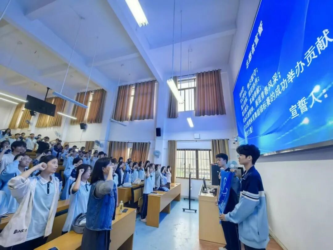 承接赛事协办邀请函后,我校团委高度重视,将此次任务视为展示财校学子风采的宝贵契机。通过广泛动员与严格遴选,一支102人的志愿者队伍迅速集结。赛前,由团委黄健萍老师和陈伟晶老师组织举行了一场庄严的动员大会暨培训会,会后由团委徐玥老师带领志愿者们系统学习了岗位技能与服务礼仪。在铿锵有力的宣誓中,将“用心”二字内化于心,外化于行,为提供有温度、有品质的服务做足了准备。
