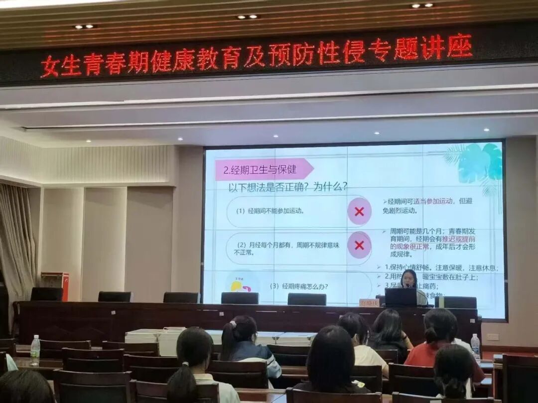 本次专题讲座由校医黄奕医生及心理教师罗海文、赵晓庆老师主讲。三位主讲老师围绕青春期身心发展特点展开系统科普,着重强调个人卫生保健的重要性,从日常清洁、合理饮食到适量运动等实用维度,为同学们提供科学指引。通过图文并茂的课件展示、真实案例的深度剖析,老师们深入浅出地讲解了生理保健常识、情绪管理技巧与人际交往原则,引导女生们以坦然心态面对成长困惑,树立健康自信的青春姿态。在预防性侵专项环节,讲座内容层层递进、重点突出。老师们先以科学严谨的态度普及性教育基础常识,涵盖性器官结构与功能、性行为潜在危害与后果、避孕知识及性传播疾病预防等核心内容,帮助同学们建立对身体的正确认知;随后结合相关法律法规与校园、生活常见场景,详细拆解性侵害的常见形式、识别方法与防范策略,反复强调“隐私部位不可触碰”的安全底线,手把手传授“勇敢说‘不’、及时求助、巧妙避险”等实用防护技能,叮嘱同学们务必珍惜自身身体与尊严,远离性侵害风险。