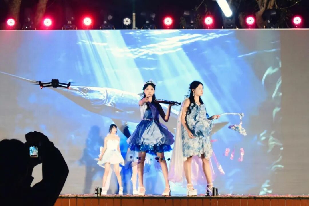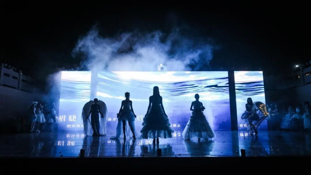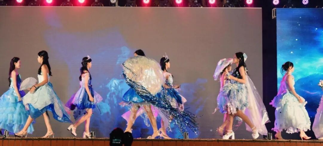 创意设计协会与礼仪协会联袂呈现的环保时装秀《蔚蓝重生》,同学们身着用废旧材料改造的“海洋系”时装,步伐自信、造型惊艳,环保理念与美学创意兼具,把废品变成了“高定”!