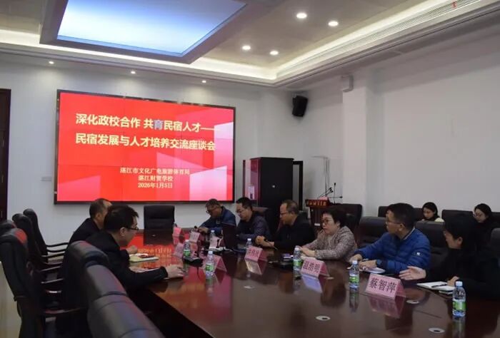 2026年1月5日,湛江市文化广电旅游体育局副局长林洪强,市场管理科科长叶建华一行莅临我校就湛江市民宿产业发展趋势、人才需求及校企政合作模式进行深入交流与指导。我校洪伟欣校长、各专业科科长以及民宿课题组核心成员参加了此次座谈会。