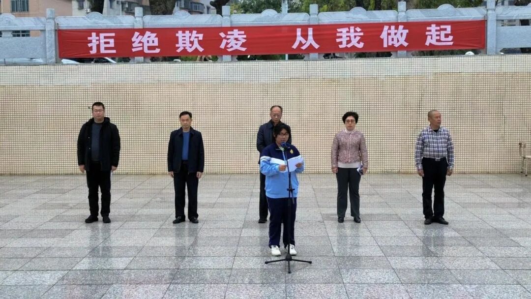 活动由洪伟欣校长亲自领读誓词,同学们整齐举起右拳,以洪亮的声音庄严宣誓,将拒绝欺凌的决心与承诺融入每一句誓言中,铿锵有力的宣誓声回荡在校园上空,彰显了全体学子守护校园和谐的坚定信念。