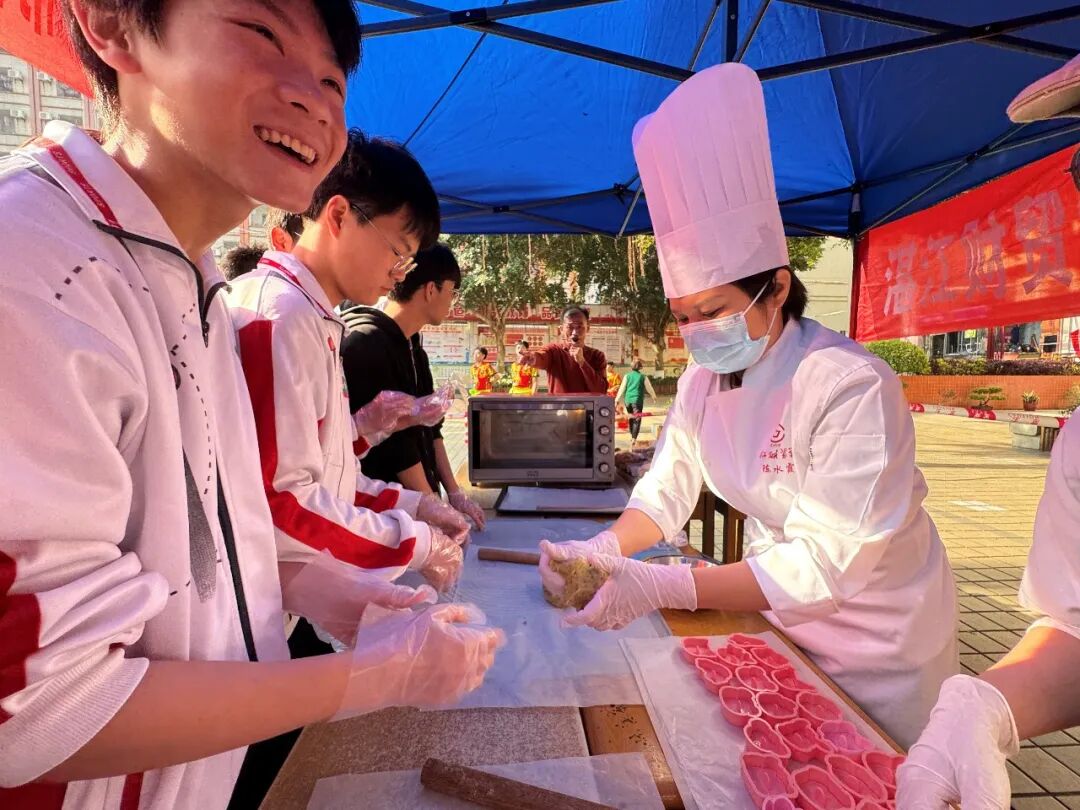 在实践环节,用本地的原材料蛤蝼叶子来做饼干,使湛江乡土植物融入食品中,充分展示了本土风味。同学们在陈老师的指导下,纷纷化身“小烘焙师”,亲手制作饼干。他们小心翼翼地搅拌面糊、认真地按压模具,现场气氛热烈而欢快。经过一番努力,一块块造型各异的饼干新鲜出炉,香气弥漫在校园。同学们品尝着自己亲手制作的饼干,脸上洋溢着自豪和喜悦的笑容。这次职业体验活动,不仅让同学们了解了烘焙行业的基本知识和技能,更在他们心中种下了职业梦想的种子,激发了他们对未来职业的探索欲望。