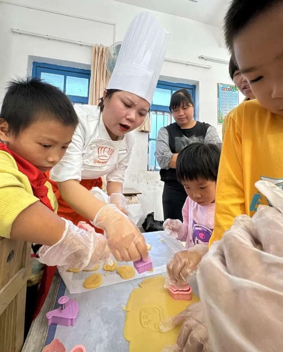 活动一开始,学校的烹饪老师们带着精心准备的制作工具和材料,走进了小学生的课堂。这些平时只能在电视上看到的烹饪工具,如今真实地出现在眼前,小朋友们兴奋不已。老师们一边讲解,一边带着小朋友们动手制作各种形状的饼干:有汽车形状的,有小熊形状的,还有小鸡小鸭形状的。小朋友们兴致勃勃,跟着老师的步骤,小心翼翼地揉面、塑形,每个人的脸上都洋溢着专注与喜悦。