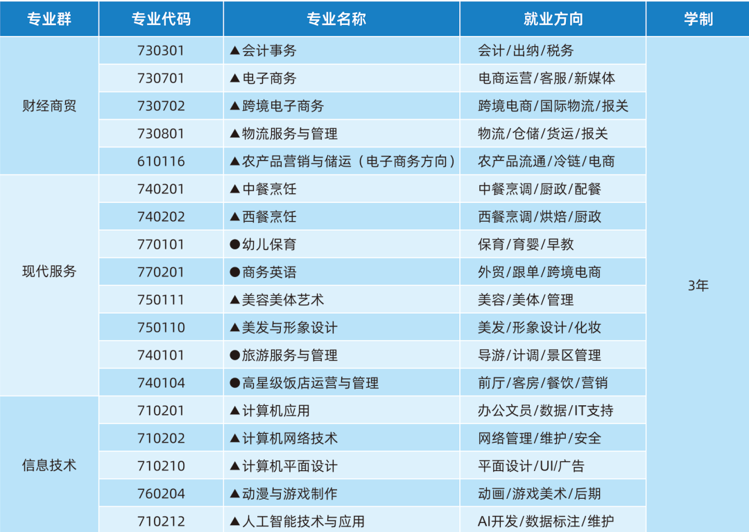 中职免学费:农村(含县镇)户籍学生,涉农专业学生,城市家庭经济困难学生可免三年中职学费,仅收住宿费700元/年(宿舍已配空调)。